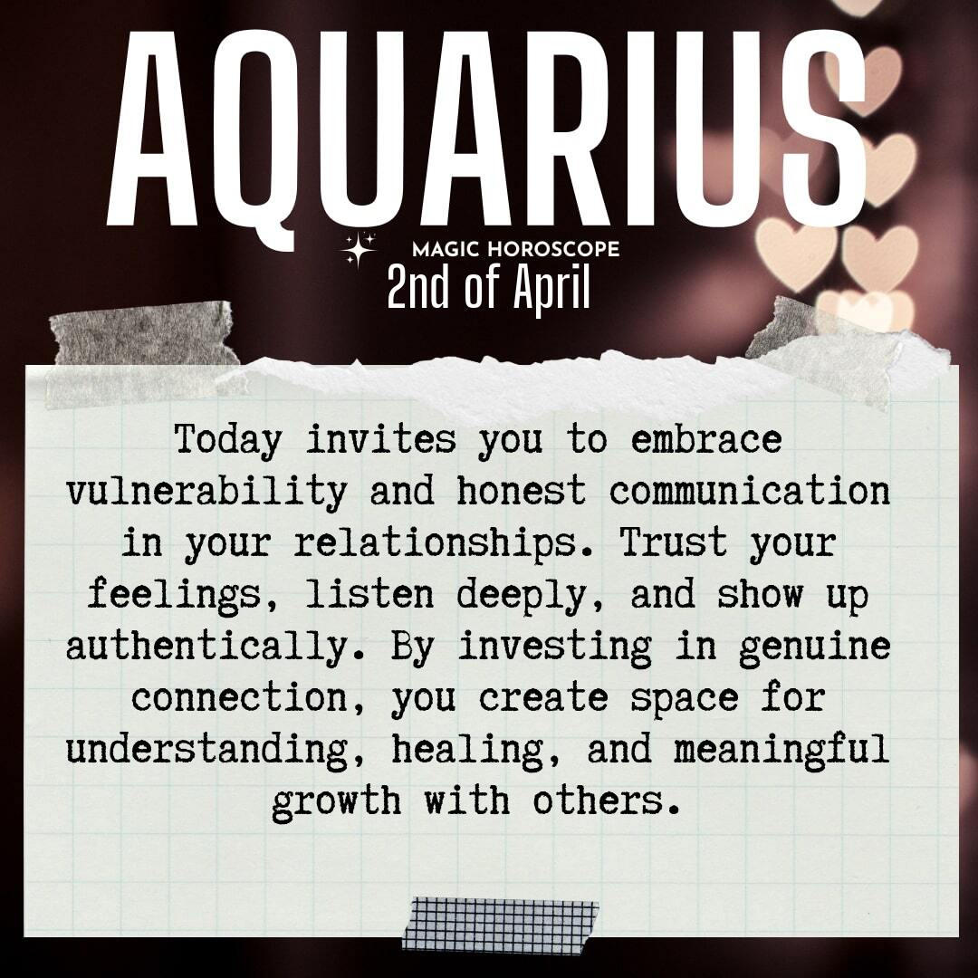 There’s a quiet truth surfacing in your relationships today, Aquarius. You may sense a longing for deeper connection, or perhaps a need to clarify your feelings with someone close. Sometimes, this yearning arrives as a gentle ache, a subtle awareness that something within you wants to be seen and understood. It’s easy to get lost in your head, analyzing every word and gesture, replaying conversations and searching for hidden meanings, but your heart knows what it wants. Let yourself feel, even if it’s messy or uncertain. Vulnerability is not weakness; it’s the doorway to real intimacy, the bridge that allows two souls to meet in their rawest, most authentic form.
