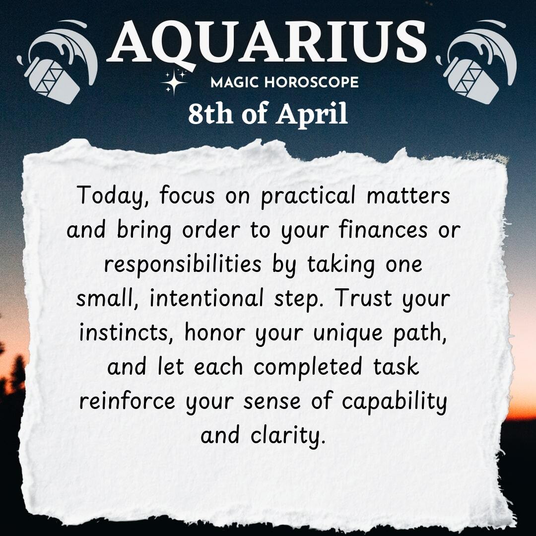 Practical matters come into focus today, Aquarius. Money, work, and daily responsibilities may feel heavier than usual, pressing on your mind and heart with a weight that is hard to ignore. Yet, within this pressure lies a hidden opportunity—a chance to bring order to the chaos that has been quietly building in the background of your life. You possess a sharp mind for problem-solving, a gift that often surprises even you, especially when you find yourself resisting the comfort and predictability of routine. Today, however, structure is not your adversary but your greatest ally. Embrace it, and you will find that it creates space for what truly matters, allowing your spirit to breathe and your creativity to flourish.
