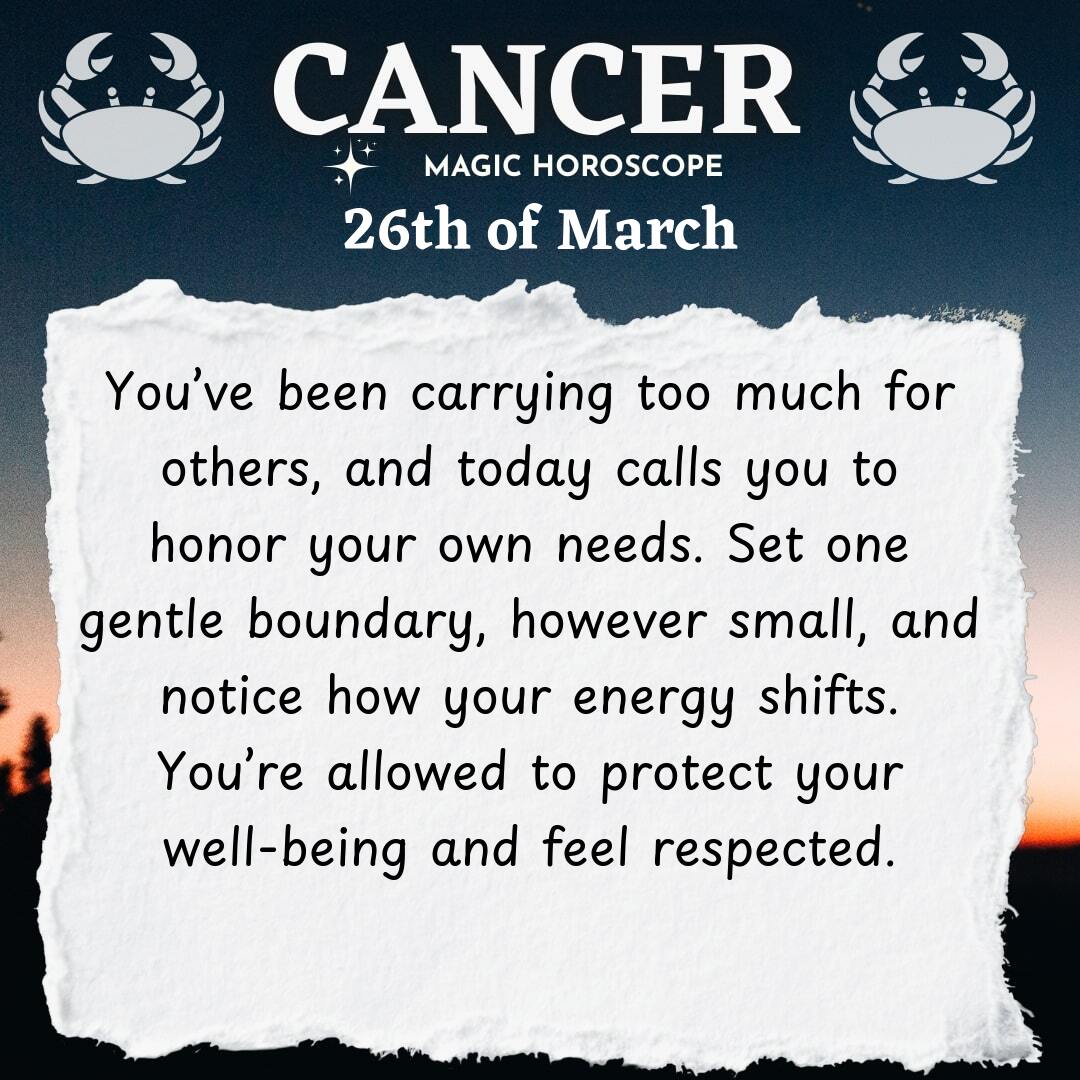 You’ve been carrying more than your share lately, Cancer. The weight of other people’s expectations, the urge to keep everyone happy—it’s exhausting. Sometimes it feels as if you’re holding up the sky for everyone around you, quietly absorbing their worries and smoothing over their rough edges, even when your own heart is heavy. Today is about boundaries, about remembering that your needs matter just as much as anyone else’s. It’s not selfish to protect your energy; it’s necessary. You are not meant to be the endless well that everyone draws from without ever being replenished.