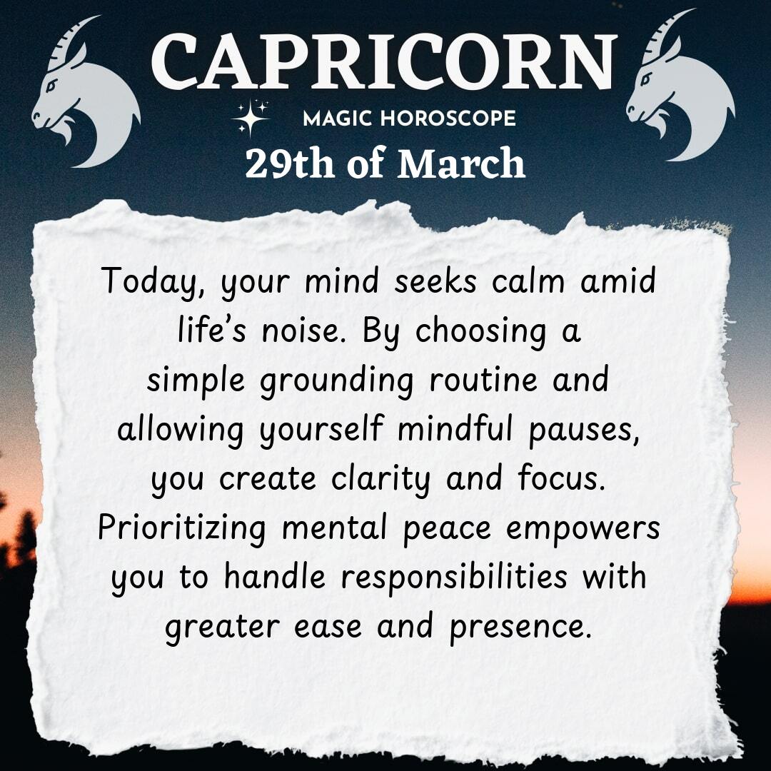 Your mind craves calm today, Capricorn. The world can be noisy, and your responsibilities often pull you in many directions, leaving you feeling stretched thin and sometimes even invisible beneath the weight of your obligations. Yet, mental peace isn’t something you stumble upon—it’s something you create, moment by moment, with intention and gentle persistence. Notice where your thoughts are scattered or restless, darting from one worry to the next, or replaying conversations and to-do lists in an endless loop. Instead of pushing through with sheer willpower, pause and give yourself permission to reset, to breathe, and to honor your need for stillness.