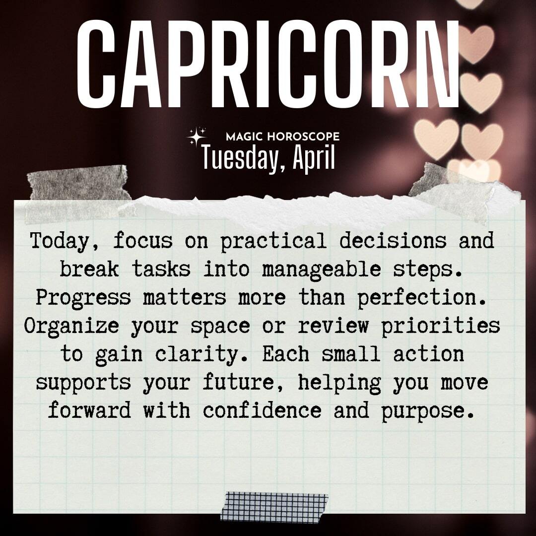 Practical matters come into focus for you today, Capricorn. There’s a decision on the table—maybe about work, finances, or a project that’s been lingering in the background, quietly asking for your attention. You may feel the weight of responsibility pressing on your shoulders, as if the universe is gently nudging you to address what you’ve set aside. Your natural ability to see the long game is a gift, but even the most visionary plans require tending to the small, sometimes tedious details. Today is about breaking things down into manageable pieces, making choices that support your bigger vision, and honoring the process as much as the outcome.