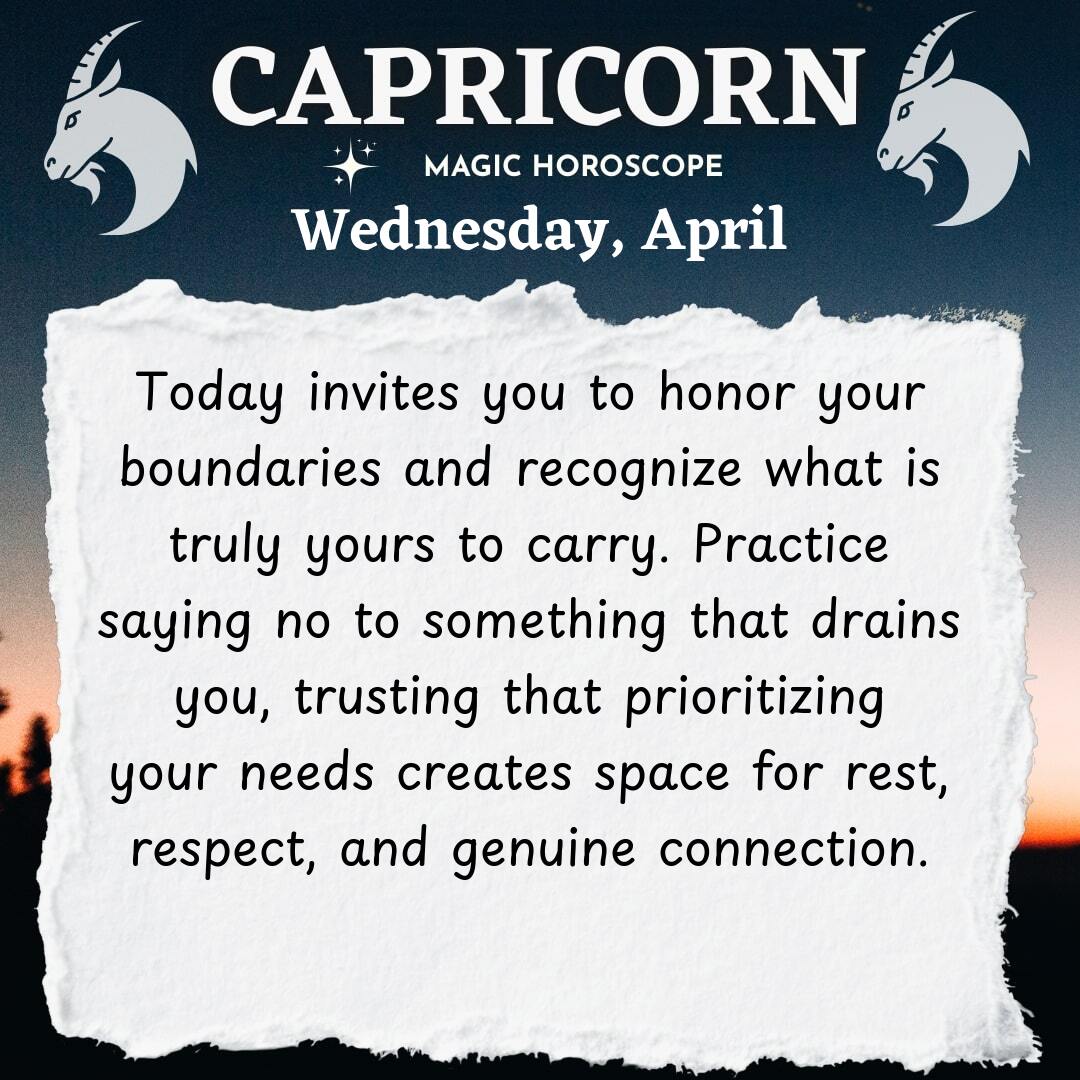 Boundaries are your focus today, Capricorn. You may notice where you’ve been carrying more than your share—at work, in relationships, or even in your own mind. Perhaps you’ve been the one others turn to for support, advice, or solutions, and while your reliability is a gift, it can also become a quiet burden. It’s time to recognize what’s truly yours to hold, and what you can gently set down. There is a quiet strength in acknowledging your limits, in understanding that self-worth is not measured by how much you endure or how many responsibilities you shoulder for others.