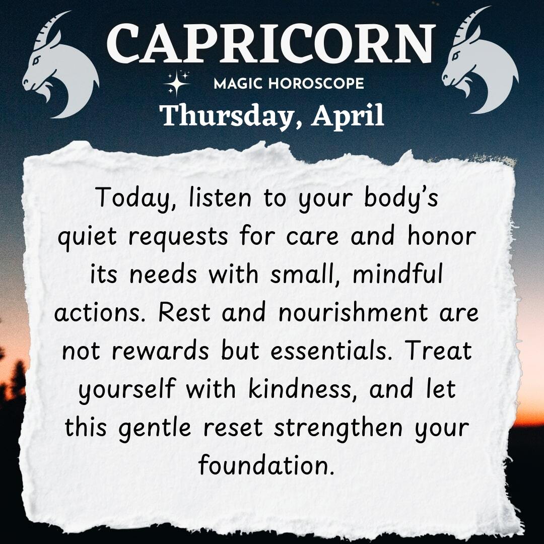 You’re being called to check in with your body today, Capricorn. The pace you keep is admirable, and your determination often inspires those around you, but your physical self is quietly asking for more attention than you may realize. Notice the subtle signals—tension in your shoulders that seems to build with each passing hour, a tiredness that lingers even after a full night’s sleep, or a craving for something nourishing that you might usually ignore. These are not inconveniences to push through or obstacles to overcome, but gentle invitations to reconnect with yourself on a deeper, more compassionate level. Your body is your foundation, the vessel that carries you through every challenge and triumph, and it’s time to honor it with the same dedication you give to your ambitions.