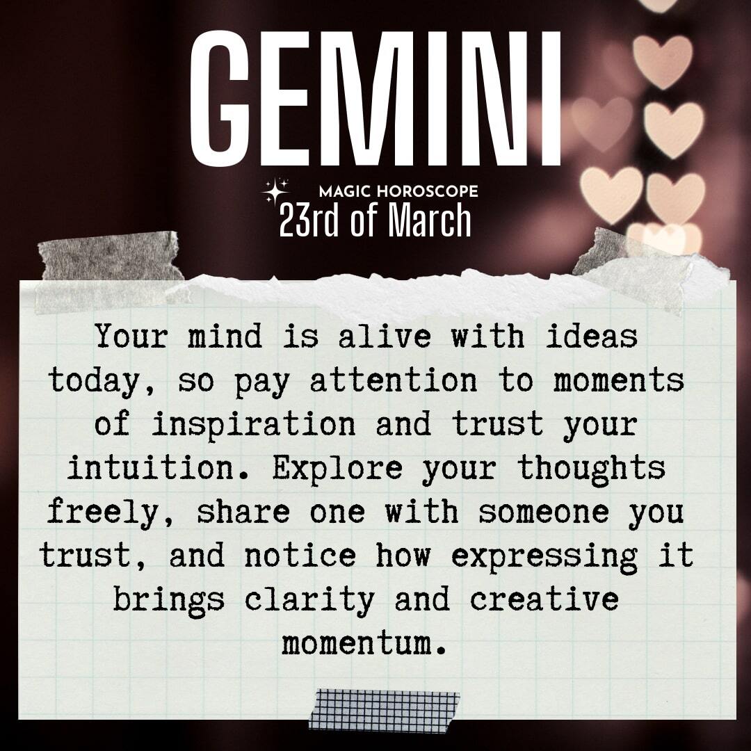 Your mind is a wellspring of ideas today, Gemini. Inspiration may strike in unexpected places—a passing conversation, a song lyric, a sudden flash of insight that seems to come out of nowhere. These moments, though fleeting, carry a special kind of magic. Don’t dismiss them or brush them aside as mere distractions. Your intuition is speaking, sometimes in whispers, sometimes in bold declarations, and it’s worth listening closely. There is wisdom in these subtle nudges, and sometimes, the best ideas come when you’re not trying so hard to find them, when you’re simply open to receiving whatever the universe wants to offer.