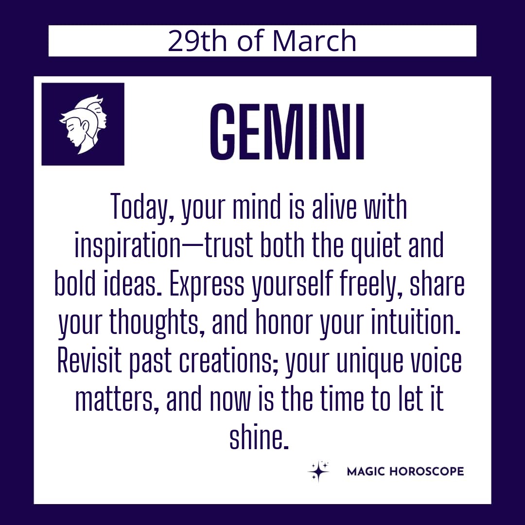 As the day unfolds, hold space for both the chaos and the calm within you. Let your mind wander, let your heart speak, and trust that every idea, no matter how fleeting, has a place in your journey. You are a vessel for inspiration, Gemini, and today the universe is inviting you to open wide and receive.