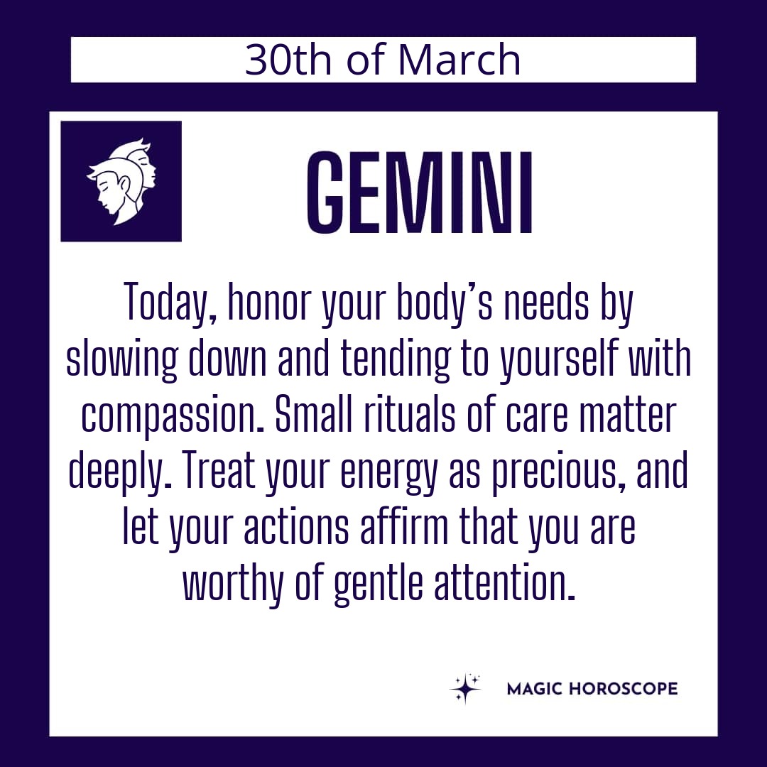 You’re being called to listen to your body today, Gemini. The pace of your mind is quick, always darting from one idea to the next, but your physical self needs gentler attention, a softer rhythm. Notice where you’re pushing yourself out of habit, perhaps out of a sense of duty or the desire to keep up with expectations, and ask if it’s truly serving you in this moment. Sometimes, the most radical act is to slow down and honor your limits, even when the world expects you to keep moving, to keep producing, to keep striving. Your energy is precious—treat it as such, with the reverence you would offer to something rare and irreplaceable.