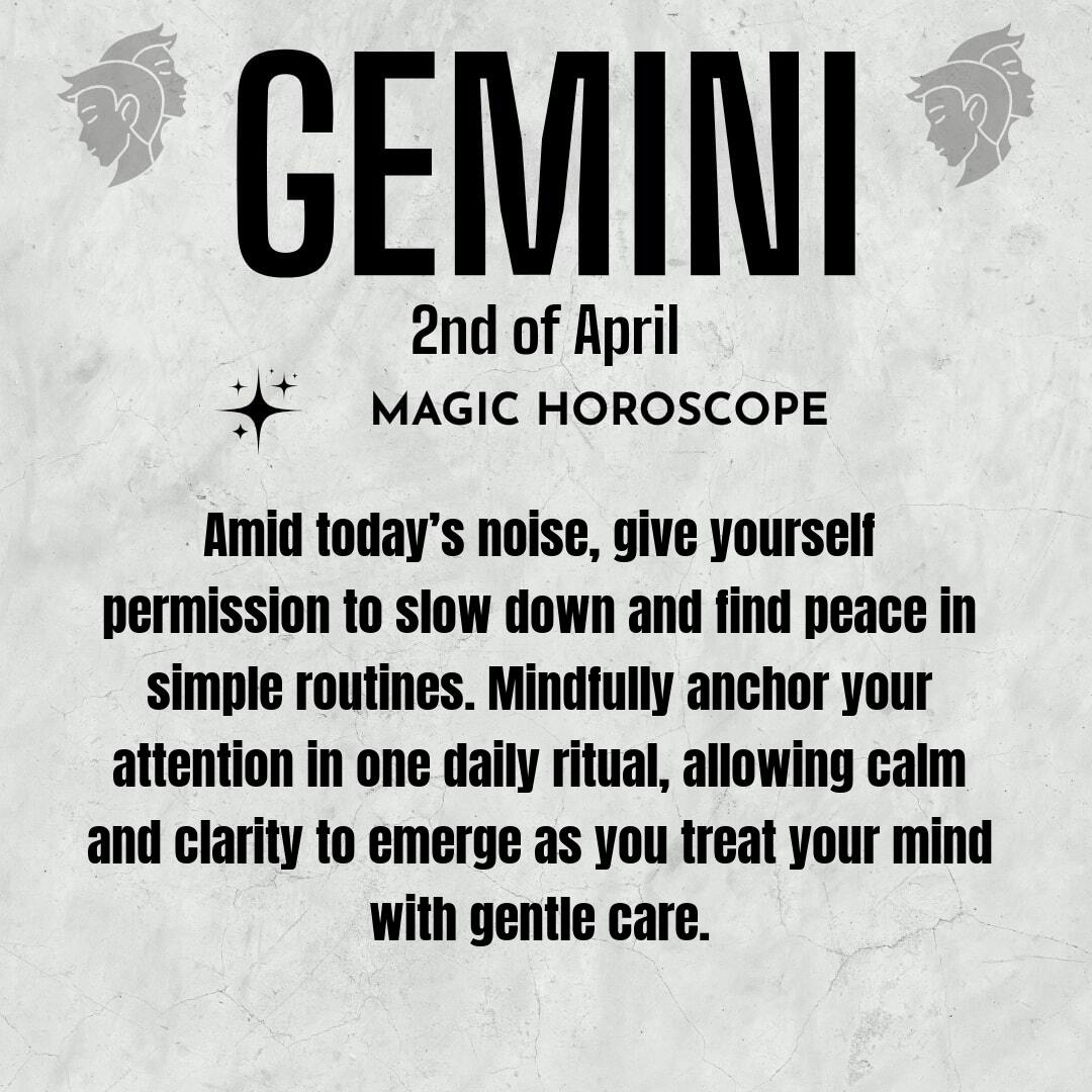 Your mind craves peace today, Gemini. The world is noisy, and your thoughts can easily spiral into overdrive, swept up by the constant stream of information and demands that seem to pull you in every direction. It’s tempting to multitask, to chase every distraction that flashes before you, hoping that productivity will bring relief. Yet, you may notice that the more you scatter your attention, the more restless you feel inside. True focus, the kind that brings real satisfaction and calm, comes not from doing more, but from embracing stillness. Give yourself permission to slow down, to step away from the chaos, and to create a pocket of quiet in your day. This is where clarity lives, waiting patiently for you to return.