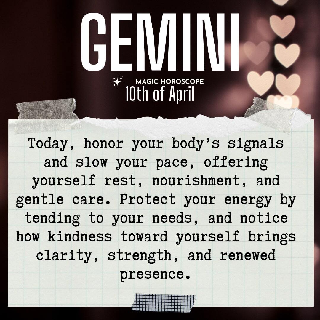 Remember, Gemini, your worth is not measured by how much you accomplish or how quickly you move. It is found in the gentle way you care for yourself, in the patience you offer your own heart. Today, let your body be your guide. Let presence be your practice. And know that every act of self-care, no matter how small, is a step toward greater wholeness and peace.