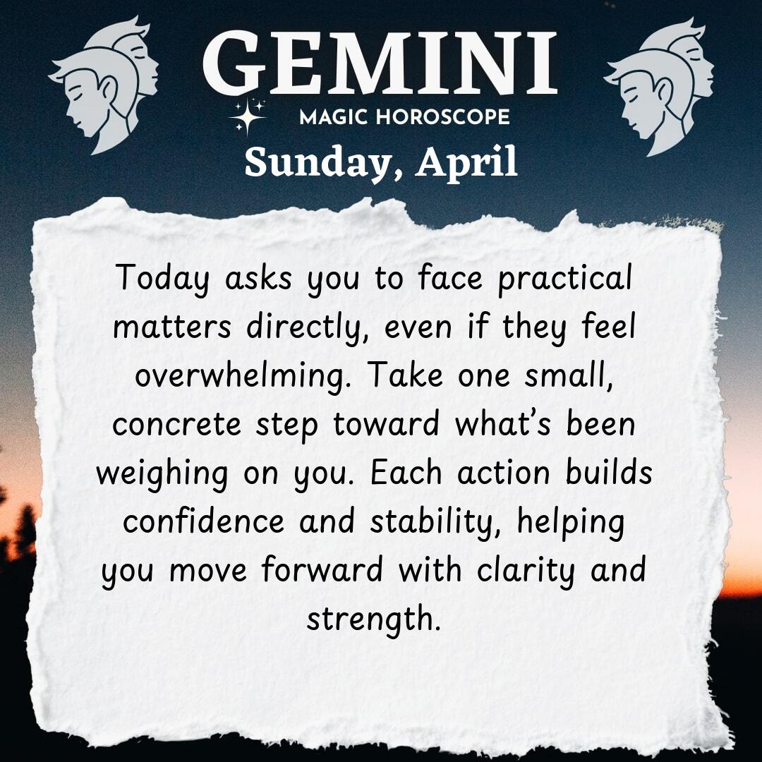 Practical matters are front and center for you today, Gemini. The demands of money, work, and the countless decisions that shape your daily life are calling for your attention, perhaps more insistently than usual. You may feel the weight of responsibilities pressing in, making it tempting to retreat into distraction or to push aside choices that seem too heavy to face right now. Yet, deep down, you know that avoidance only adds to your stress, creating a cycle that leaves you feeling even more burdened. Today is about breaking that cycle—about facing things head-on, with a sense of courage and clarity that comes from within.