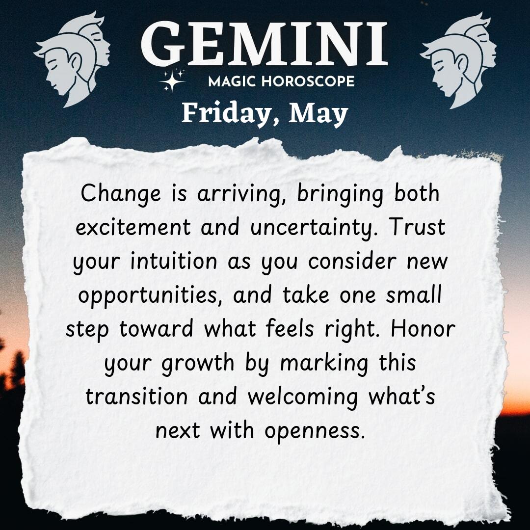 A new chapter is unfolding, Gemini. Change is in the air, and you may feel both excitement and uncertainty swirling within you, like the first breath of spring after a long winter. There’s a sense that something is shifting, even if you can’t quite name it yet. Opportunities are presenting themselves, some obvious and shining brightly before you, others subtle and quietly waiting for your attention. You might feel the urge to act quickly, to seize what’s in front of you before it slips away, but don’t rush to decide. Instead, let yourself sit with the possibilities, allowing them to settle in your heart and mind. Notice what lights you up from the inside, what makes your spirit feel lighter, and also pay attention to what feels heavy or burdensome. Your intuition, that quiet inner voice, will guide you toward the right path if you give it space to speak.