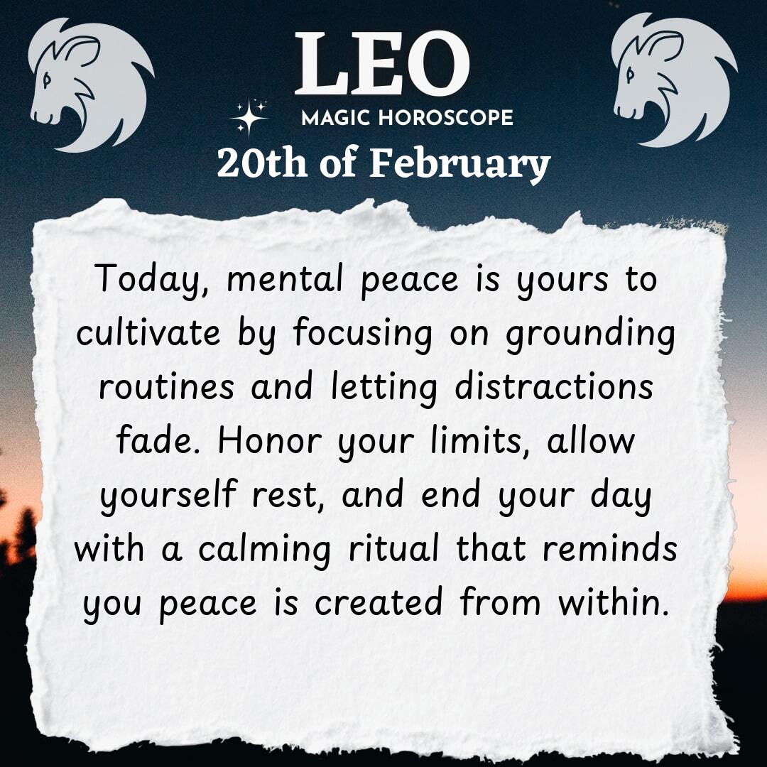 Mental peace is your anchor today, Leo. The world can feel noisy and demanding, but you have the power to create calm within. It starts with your routine—the small, steady habits that ground you when everything else feels uncertain. Focus on what brings you clarity and focus, and let the rest fade into the background..