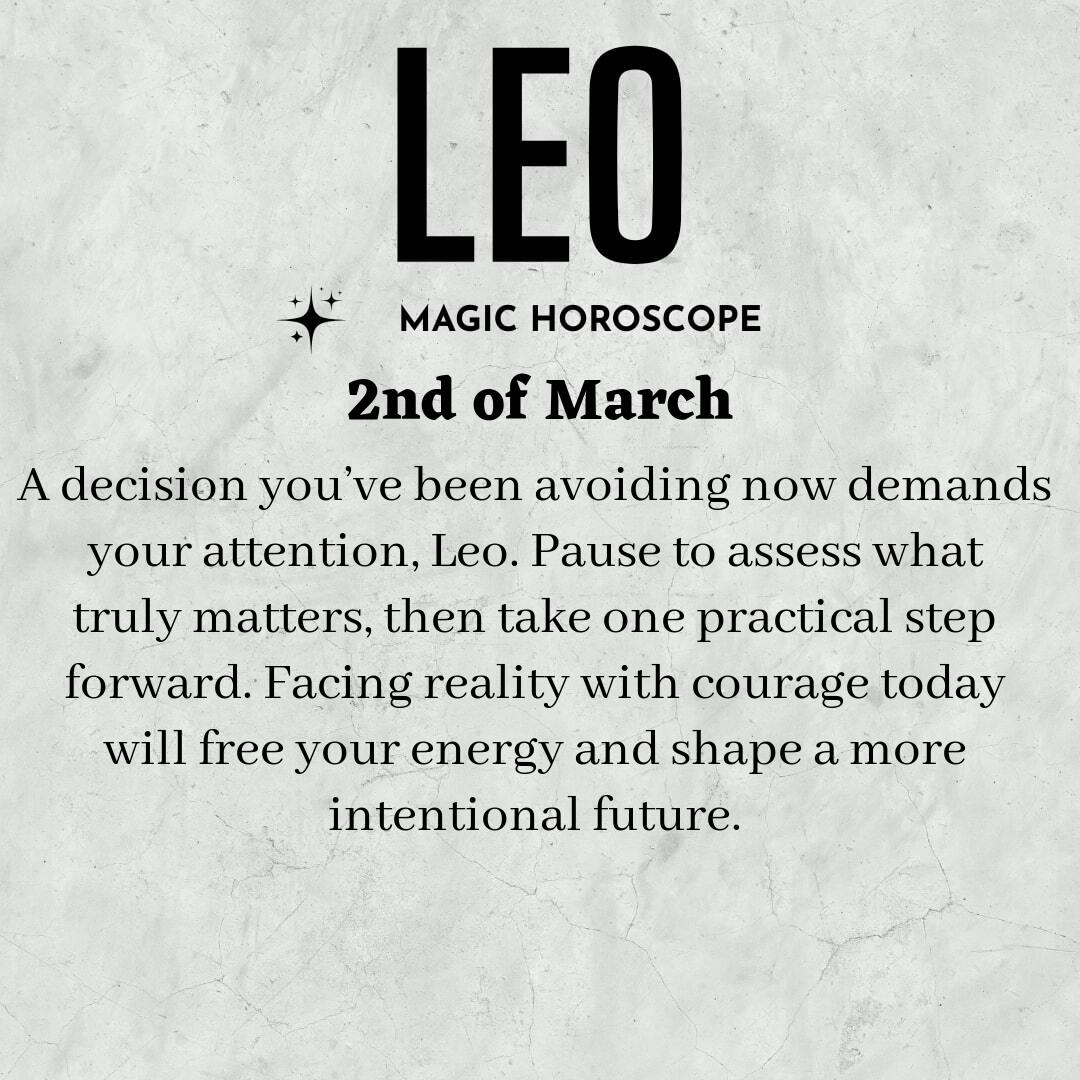 Practical matters come into focus now, Leo. There’s a decision on your plate that can’t be postponed any longer. Maybe it’s about your work, your finances, or a project that’s been lingering in the background. Avoiding it only adds to your stress. Today is about facing reality with courage and clarity..