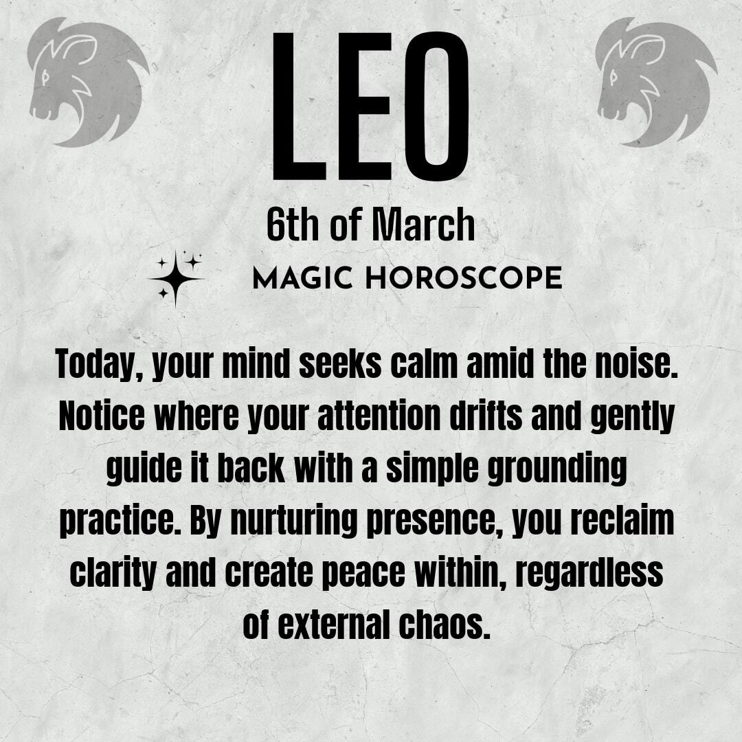 Your mind craves stillness today, Leo. The world is noisy, and it’s easy to get swept up in distractions. But peace is not found in the absence of chaos—it’s cultivated from within. You have the power to create a sanctuary in your own routine, a place where your thoughts can settle and your spirit can breathe..