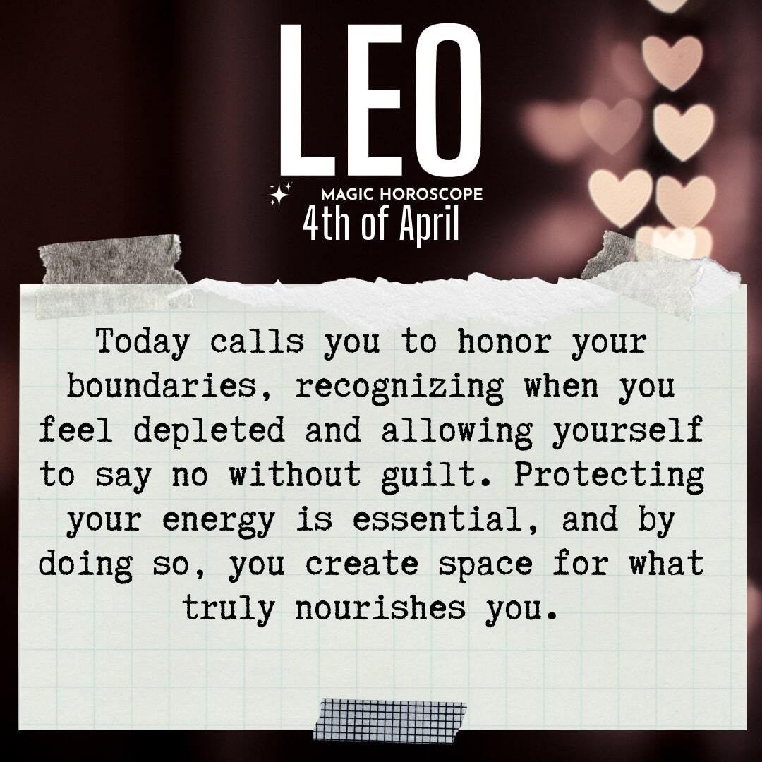 Boundaries are your focus today, Leo. You’ve been generous with your time and energy, often giving more than you realize, but lately, you may feel stretched thin, as if the world is asking more of you than you have to give. It’s not selfish to protect your space; it’s necessary for your well-being and your spirit. When you say yes to everything, you end up saying no to yourself, and over time, that quiet sacrifice can build into a heavy weight you carry alone.