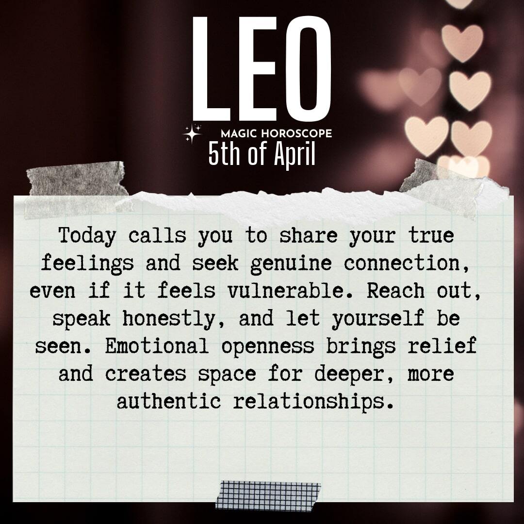 There’s a longing for honesty in your relationships today, Leo. Deep within, you sense a yearning for something more genuine, a connection that goes beyond surface-level exchanges and polite smiles. You crave connection that feels real, not just polite or expected, and you may find yourself growing weary of conversations that skim the surface, leaving your heart untouched. Perhaps you’ve been holding back your true feelings, afraid of rocking the boat or being misunderstood, worried that your authenticity might be too much or that your vulnerability could be met with silence or judgment. Yet, despite these fears, your heart is restless, and it’s time to let your truth be seen, to allow your inner world to breathe and be acknowledged.