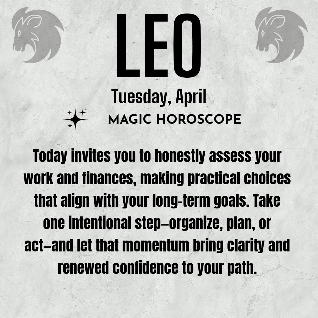 Allow yourself to trust in the process, knowing that every effort you make is a testament to your growth and resilience. The universe supports those who support themselves, and by choosing to act with intention, you invite abundance and clarity into your life. Today is yours to shape, Leo—embrace it with courage, honesty, and the unwavering belief that you are capable of creating the future you desire.