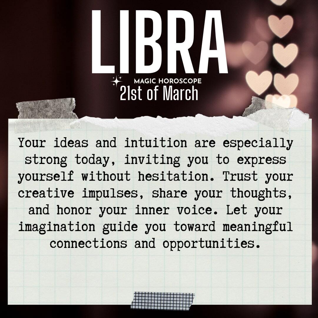 Remember, Libra, your voice truly matters. The world is richer when you allow yourself to be seen and heard. Even if it feels vulnerable, let your ideas take shape and find their way into the world. Trust in your creative spirit, and know that by sharing your unique perspective, you are making a meaningful contribution. Let your light shine, and watch as new doors begin to open before you.