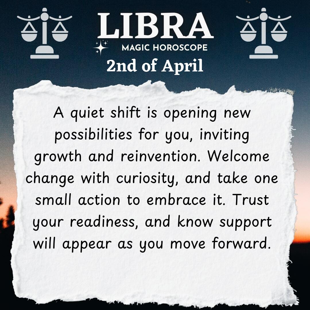 A new chapter is quietly unfolding, Libra. You may sense a shift in the air—a fresh opportunity, a change in routine, or a door opening where you least expected. There’s a subtle energy around you now, a gentle nudge that something is about to transform. Perhaps it’s a conversation that lingers in your mind, a sudden urge to try something different, or a feeling that the familiar is no longer enough. Change can be unsettling, stirring up old fears or uncertainties, but it’s also a chance to grow, to reinvent, to step into a version of yourself you’ve only glimpsed before. This is a moment to honor your courage, even if it feels quiet or tentative.