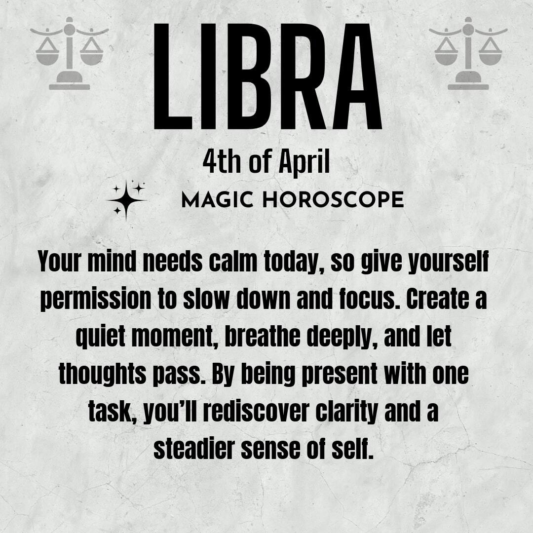 Your mind craves calm, Libra. Lately, the noise of daily life—endless notifications, unfinished tasks, scattered thoughts—has left you feeling stretched thin. The constant demands and expectations, both from others and from yourself, have created a background hum that never seems to quiet. You may notice how even in moments of rest, your thoughts race ahead, planning, worrying, or replaying conversations. It’s as if your mind is always on, searching for a moment of silence that feels just out of reach. Today, give yourself permission to slow down and reclaim your focus. Mental peace isn’t a luxury; it’s a necessity for your well-being.