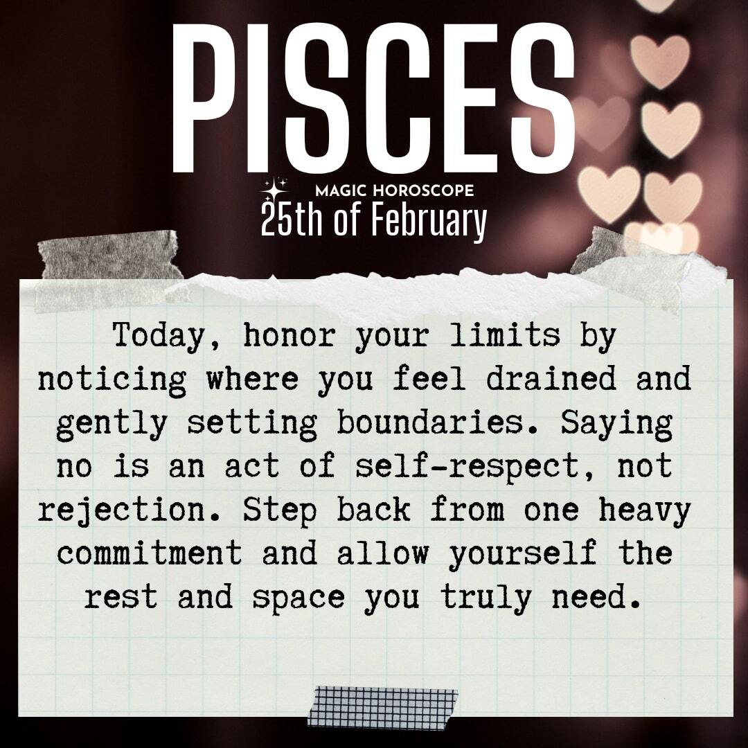 Boundaries are your focus today, Pisces, and it’s time to honor your limits. You give so much, often without realizing how much it costs you. There’s a quiet exhaustion that comes from always saying yes, from carrying burdens that aren’t yours to hold. Today, notice where you feel drained or resentful. These are clues that a boundary needs to be set..