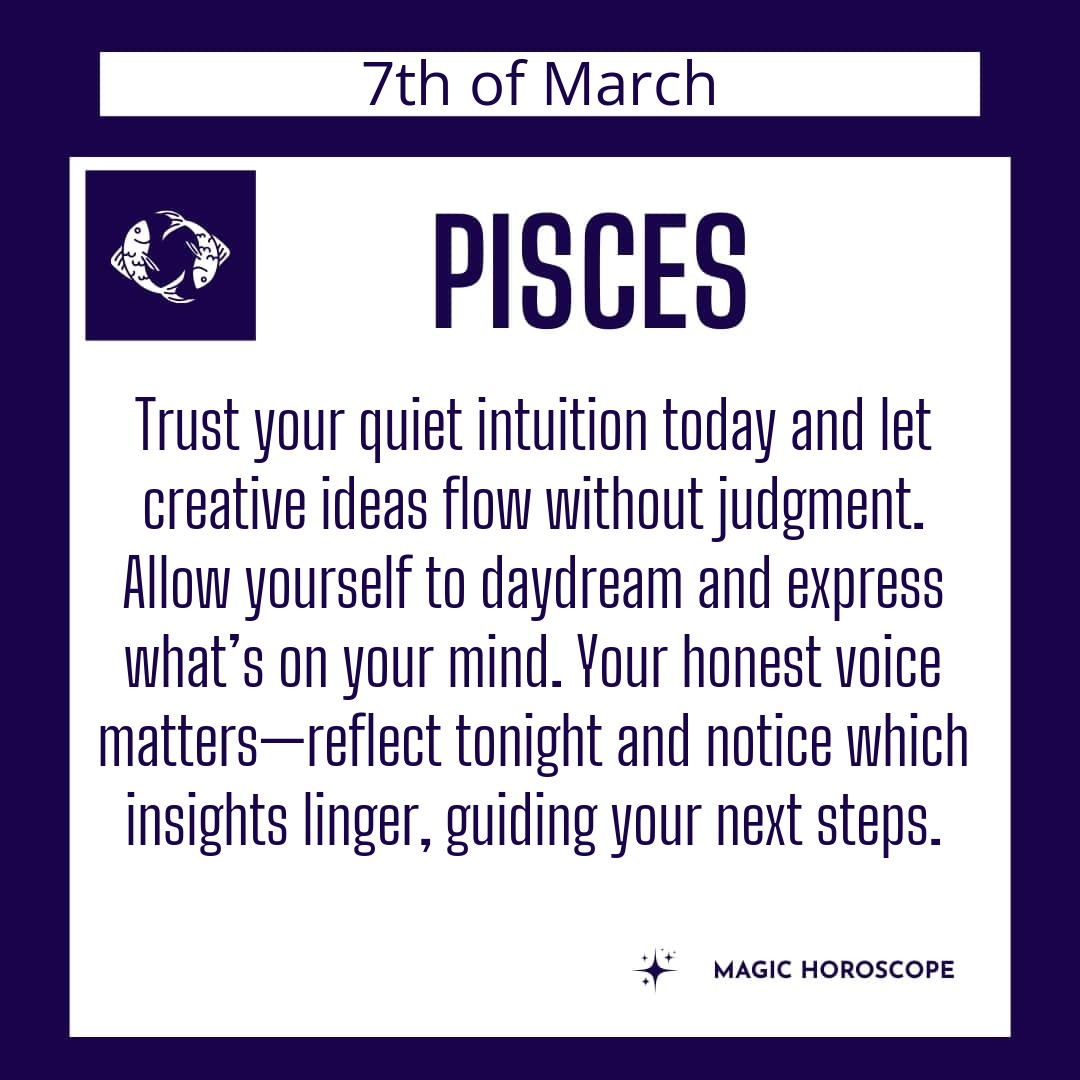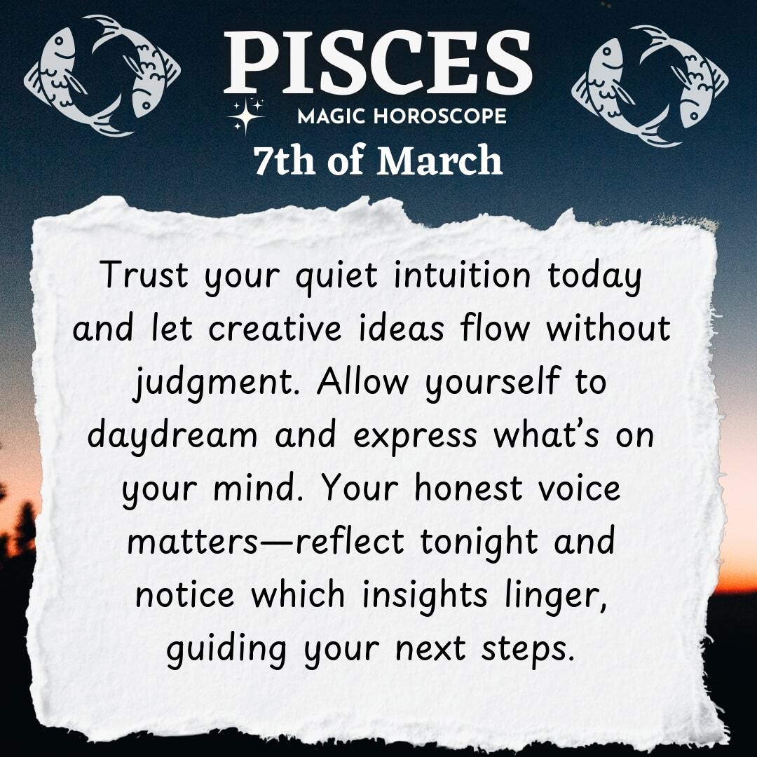 Let this gentle awareness carry you forward, Pisces. Trust in the quiet power of your inner voice, and know that by honoring your intuition, you are honoring your truest self. The journey of creativity and self-discovery is ongoing, and every moment you spend listening brings you closer to the life you are meant to create.
