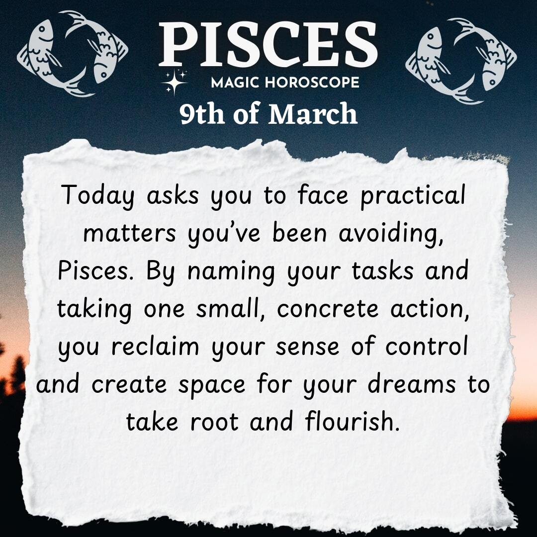 Practical matters are calling for your attention today, Pisces. Money, work, and decisions you’ve been putting off are coming into sharper focus, almost as if the universe is gently nudging you to look at what you’ve been avoiding. It’s tempting to drift, to let your thoughts wander into the comforting waters of daydreams, or to hope that somehow things will sort themselves out without your direct involvement. Yet, deep down, you know it’s time to take the wheel, to steer your own course rather than letting the tides of circumstance carry you wherever they may. Avoiding the details only adds to your stress, creating a quiet tension that lingers in the background of your day.