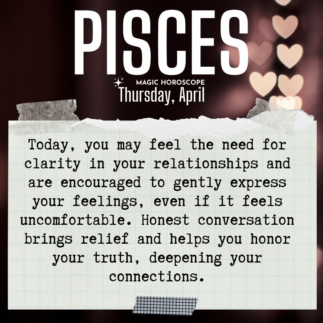 Your intuition is especially sharp today, Pisces. There’s a subtle electricity in the air, a sense that something just beneath the surface is waiting to be discovered by you alone. Ideas may come to you in flashes, sudden and bright, illuminating corners of your mind you haven’t visited in a while. You might find yourself inexplicably drawn to creative pursuits you’ve neglected, feeling a gentle pull toward painting, writing, or simply letting your thoughts drift. There’s a quiet wisdom within you, a soft voice that has always been there, waiting patiently to be heard. The challenge is to trust those inner nudges, even if they don’t make logical sense at first, even if they seem to lead you down unfamiliar paths. Your mind and your spirit are working together now, weaving new possibilities from threads you didn’t even know you held.