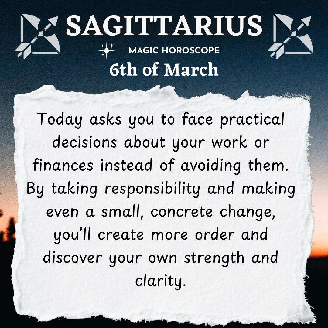 Today brings a spotlight to your work and finances, Sagittarius. You may feel a pull to make a practical decision you’ve been postponing—something about your job, a project, or your budget. The urge to avoid the details is strong, but clarity comes from facing what’s in front of you, not from turning away. It’s natural to want to sidestep the uncomfortable or tedious aspects of your responsibilities, especially when the unknown feels overwhelming or when you fear making the wrong move. Yet, there is a quiet strength in simply acknowledging what needs to be done, even if it feels daunting at first.