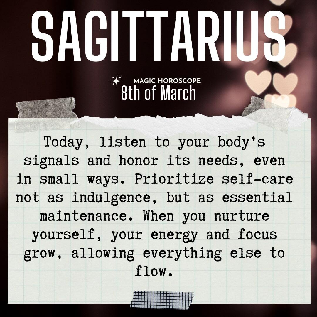 You’re being called to check in with your body today, Sagittarius. The pace of your life has been relentless, and your energy reserves are not infinite. Notice the subtle signals—tension in your shoulders, a restless mind, or that familiar urge to push through fatigue. Sometimes, you might catch yourself ignoring the ache in your back or the heaviness in your eyes, convincing yourself that you can keep going just a little longer. Instead of ignoring these signs, pause and listen. Your body is not a machine; it’s your home, and it’s asking for your attention. It’s easy to forget that your physical self is the vessel through which you experience every joy, every challenge, and every moment of growth.