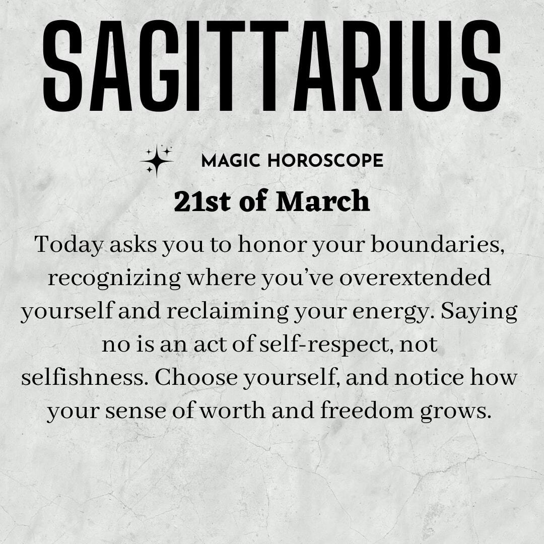 Boundaries are your theme today, Sagittarius. You’re generous by nature, often giving more than you realize. Your heart is wide open, eager to help, to support, to be the one others can lean on. But there’s a difference between kindness and self-sacrifice, and sometimes the line between the two blurs. Notice where you’ve been saying yes when you meant no, or carrying burdens that aren’t yours to hold. Reflect on those moments when you felt a quiet resistance inside, a subtle tightening in your chest, yet you pushed through for the sake of harmony or out of habit.