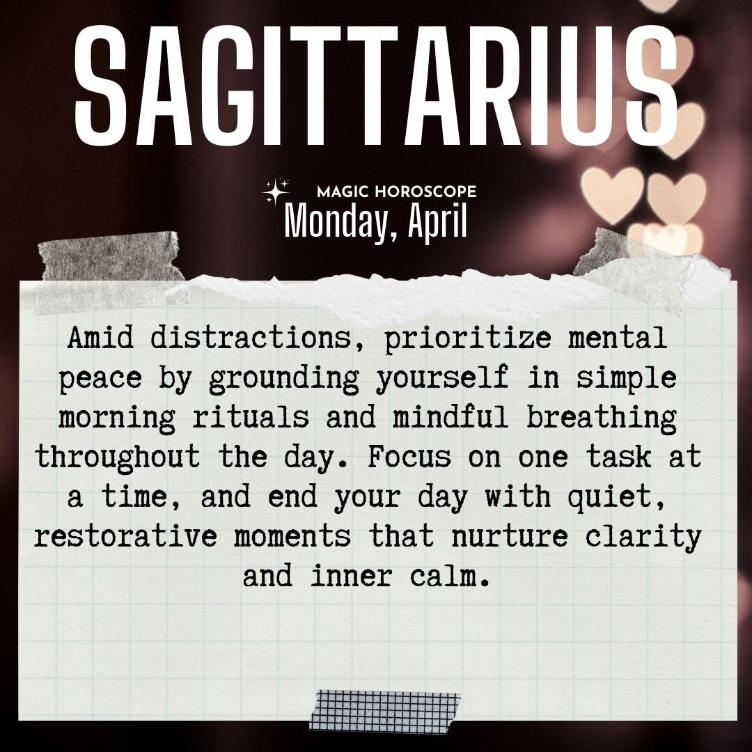 Your mind craves calm, Sagittarius, but the world keeps pulling you in a thousand directions. It can feel as if every moment is filled with noise—messages pinging, responsibilities stacking up, and the constant hum of things left undone. Distraction is everywhere—notifications, demands, unfinished tasks. Sometimes, it seems impossible to find a quiet corner within yourself, and the urge to escape or numb out grows stronger. It’s easy to lose your center, to feel as though you are drifting further from the peace you long for. Yet, beneath the surface chaos, there is a gentle voice inside you, quietly asking for stillness.