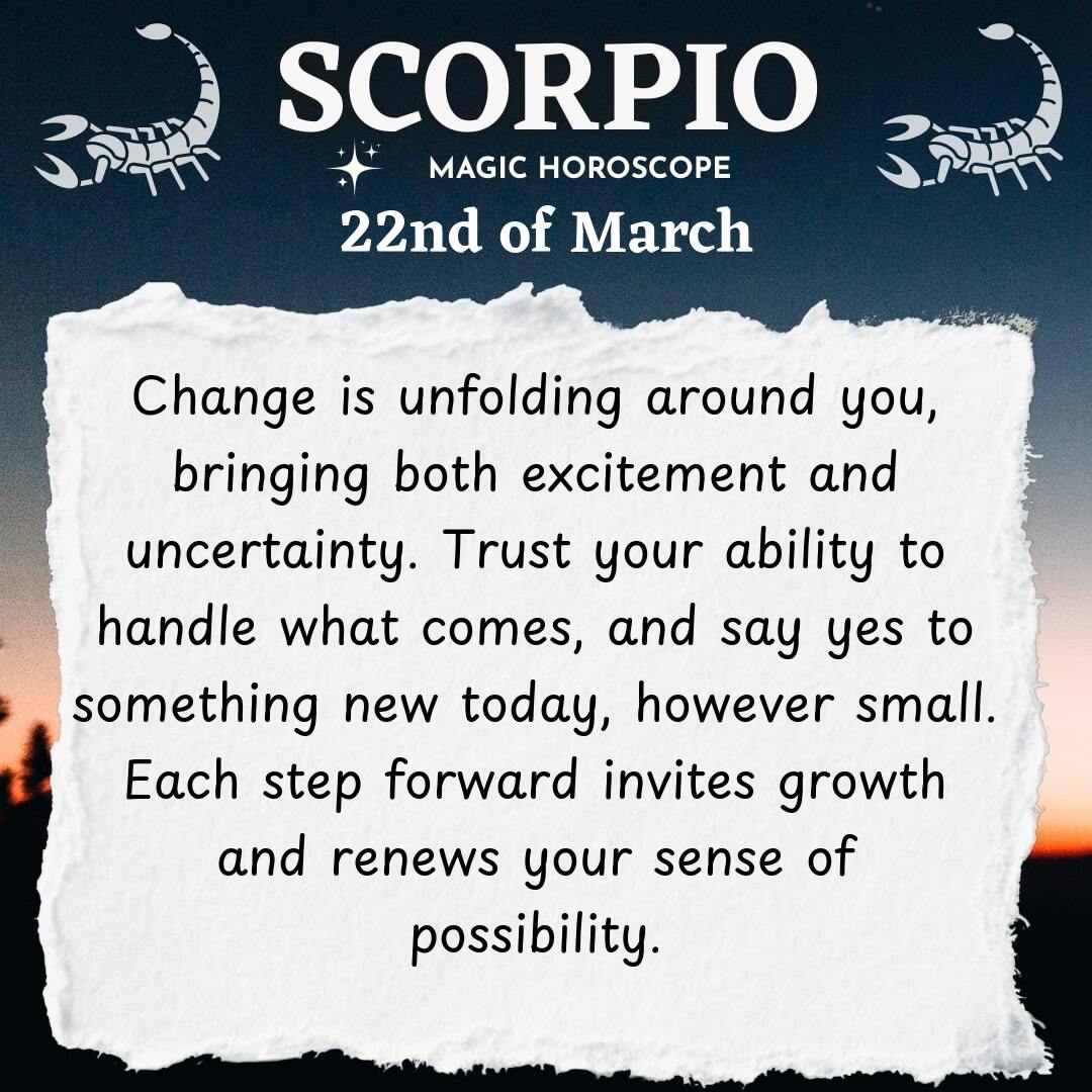 Embrace new beginnings and trust your inner strength—growth awaits beyond your comfort zone, Scorpio.