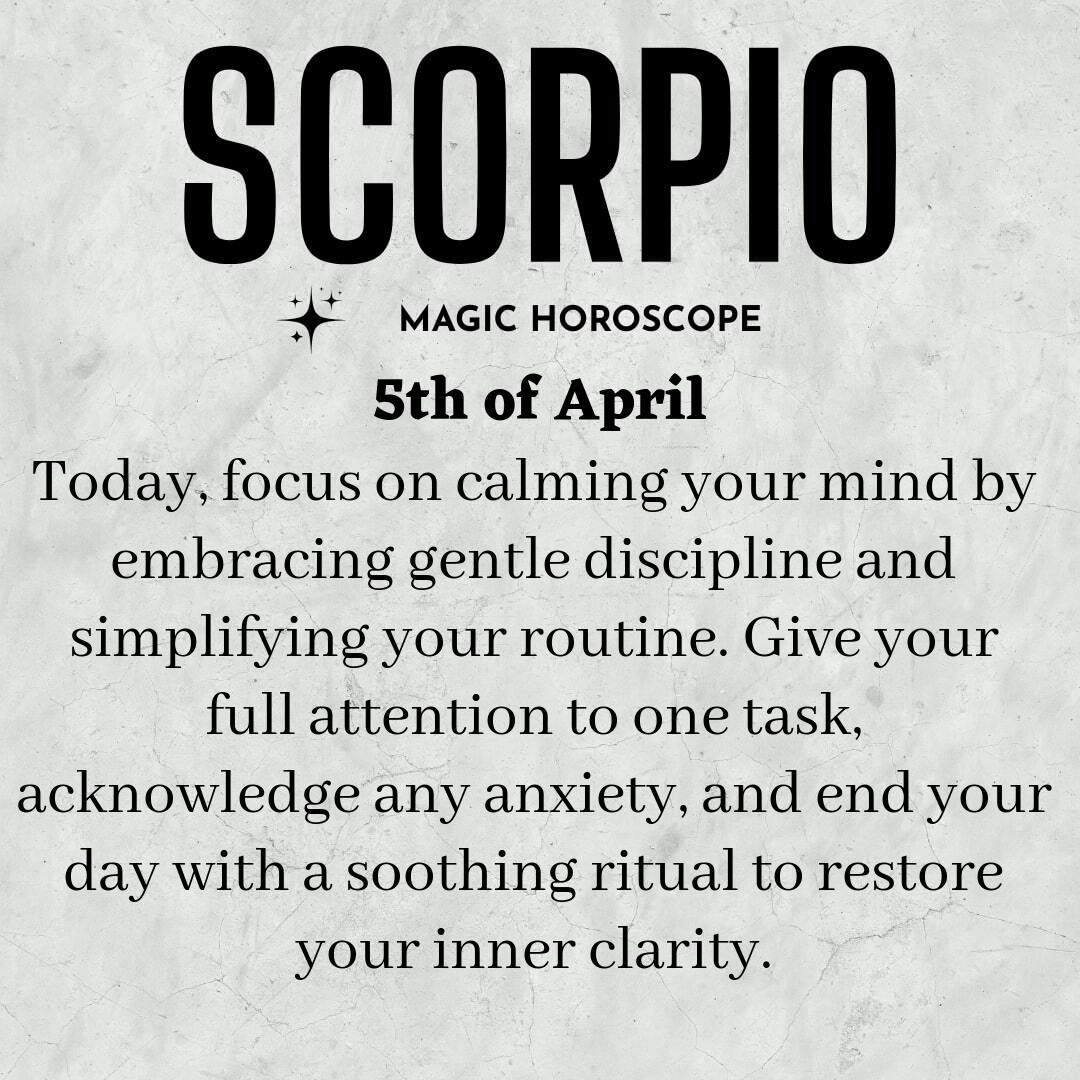 Your mind craves peace, Scorpio. The world can be noisy, and your thoughts sometimes race ahead of you, pulling you into a whirlwind of worries and what-ifs. There are days when the outside chaos seems to seep into your inner world, making it hard to distinguish your own voice from the clamor around you. Yet, beneath it all, there is a deep longing within you for stillness—a yearning to reconnect with the quiet strength that lies at your core. Today is about finding focus, not through force, but through gentle discipline, allowing yourself to move with intention rather than urgency.