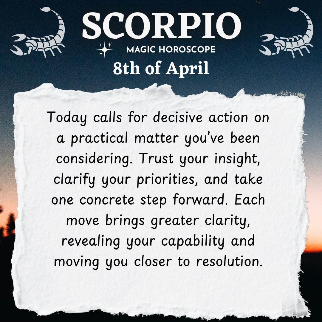 Practical matters are front and center for you today, Scorpio. There’s a decision that’s been lingering—maybe about work, money, or a project that needs your attention. You’ve been weighing your options, perhaps overthinking every angle, replaying scenarios in your mind late at night or feeling the weight of responsibility pressing on your shoulders. The uncertainty may have left you feeling restless, caught between the urge to act and the fear of making a misstep. Now is the time to trust your judgment and take a step forward, even if it’s a small one, even if your heart beats a little faster at the thought of change.