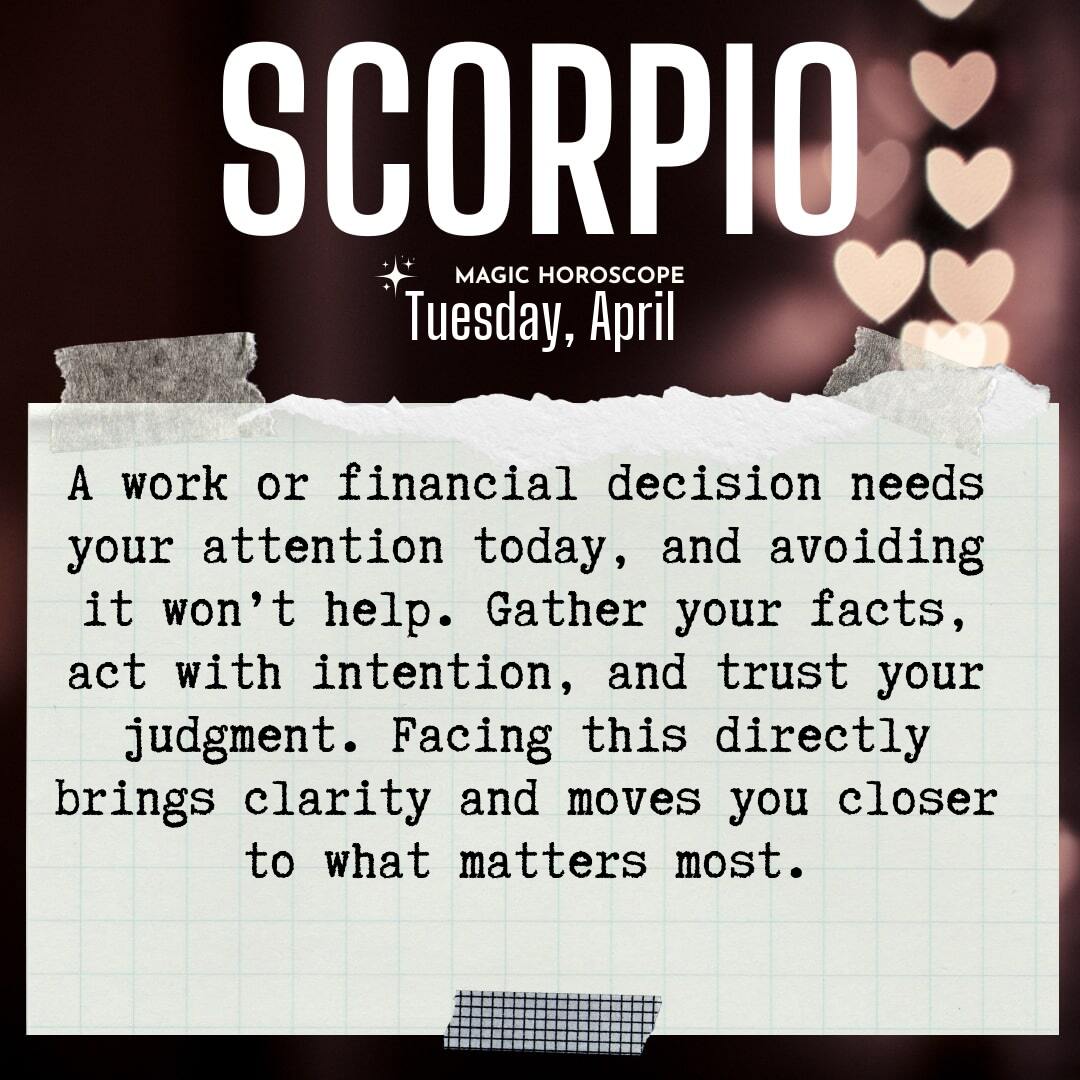 Money and work matters are in sharp focus for you now, Scorpio. The universe is gently but firmly nudging you to look at the practical side of your life, asking you to bring your attention to the decisions that have been lingering in the background. There’s a decision on the table that requires your full attention—no more putting it off or hoping it will resolve itself. The time for waiting has passed, and the energy around you is calling for action. Whether it’s a financial commitment, a career move, or a practical step you’ve been avoiding, today is about facing it head-on, with courage and honesty.