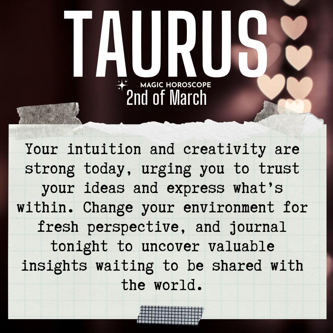 Your mind is alive with ideas today, Taurus, and your intuition is sharper than you realize. There’s a creative spark waiting to be fanned into flame, but it needs your attention and trust. Don’t dismiss those flashes of inspiration or the quiet nudges that guide you toward something new. They’re not random—they’re your inner wisdom speaking..