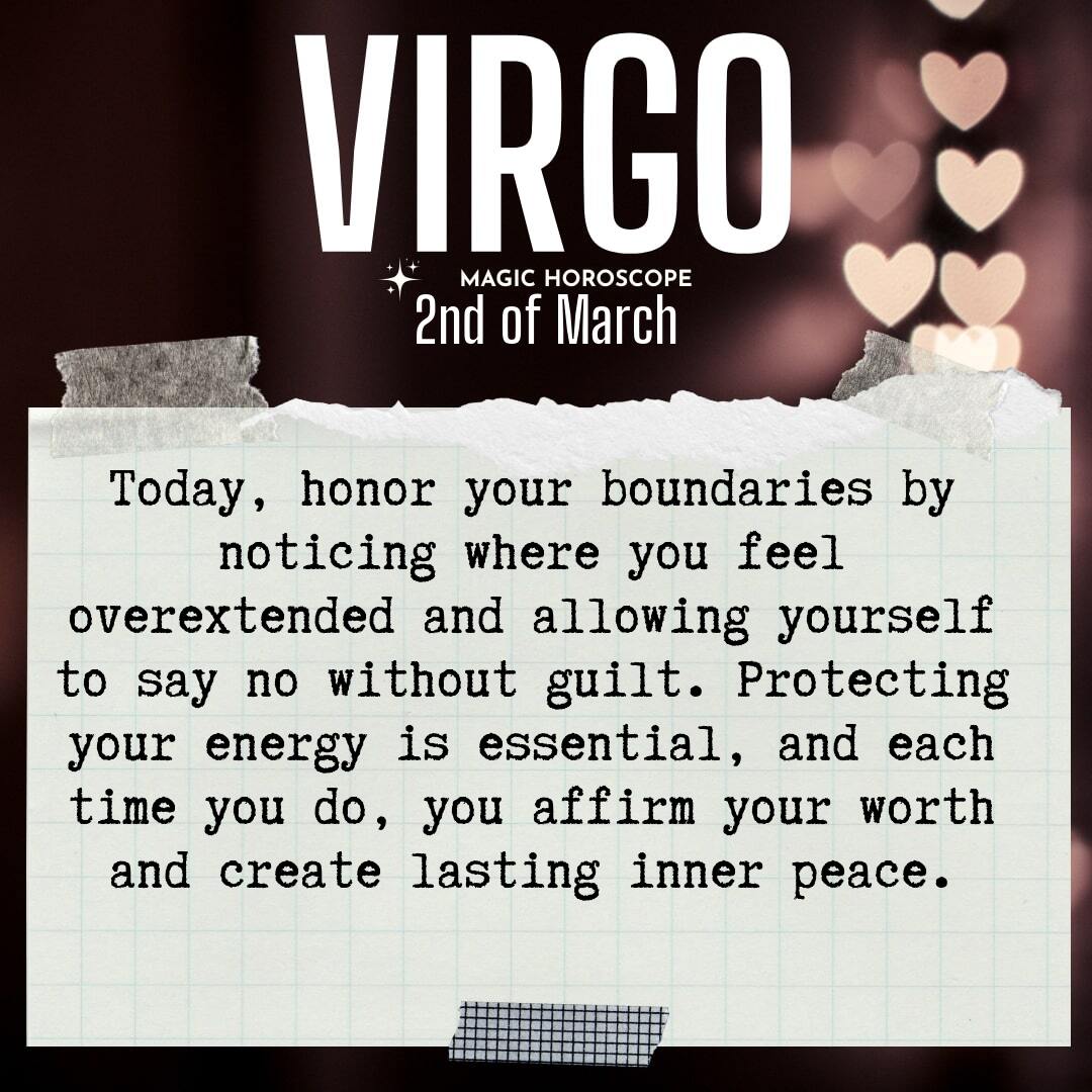 Boundaries are your focus today, Virgo. You may notice where you’ve been saying yes out of obligation, or where someone’s expectations have started to weigh you down. It’s not selfish to protect your energy; it’s essential. Your worth isn’t measured by how much you give, but by how true you are to yourself..