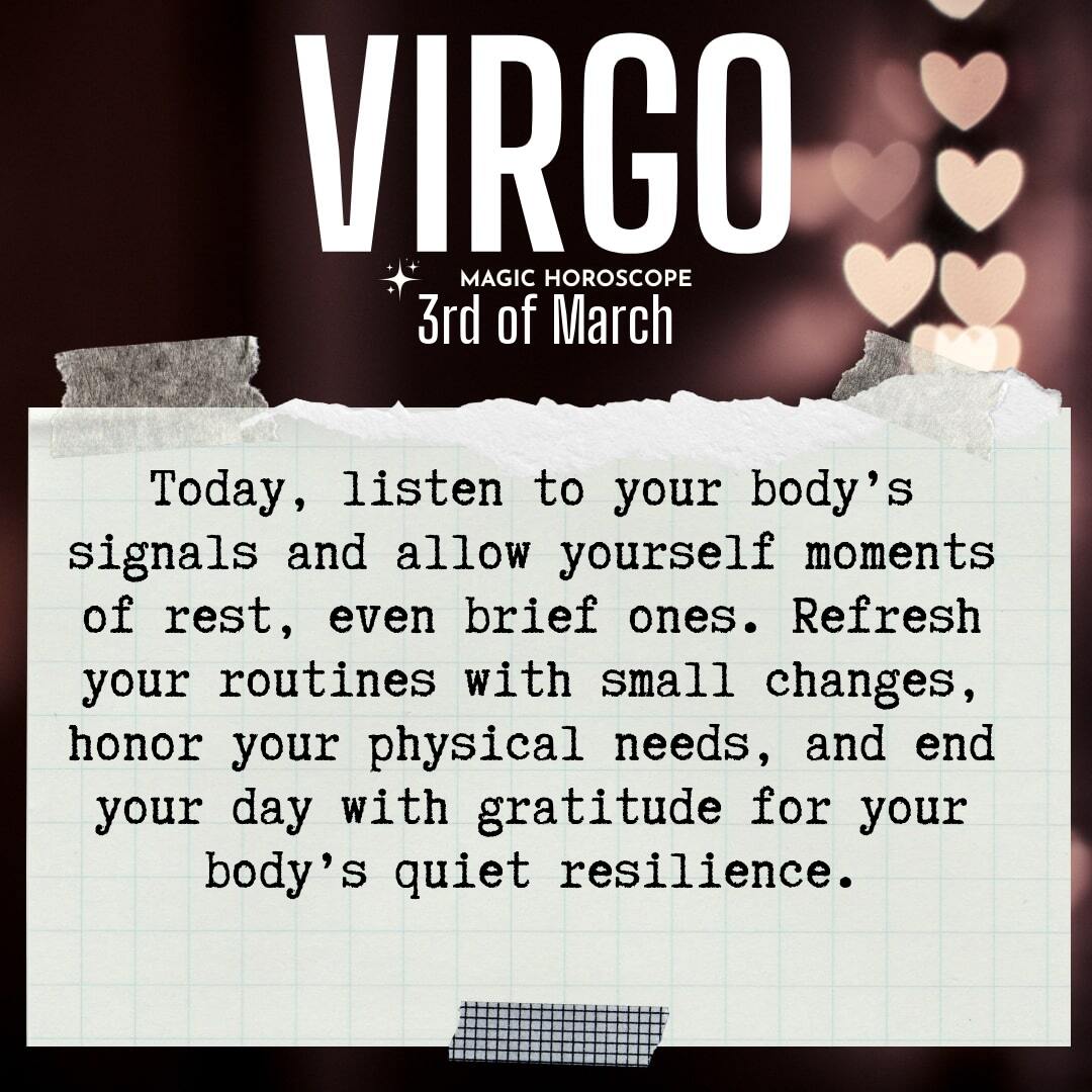 You’re being called to listen to your body today, Virgo. The subtle signals you’ve been ignoring—tension in your shoulders, that tired ache behind your eyes—are asking for your attention. You often pride yourself on pushing through, but true strength sometimes means pausing. Notice how your energy shifts when you give yourself permission to rest, even for a few minutes. Self-care isn’t a luxury; it’s the foundation for everything else you want to build..