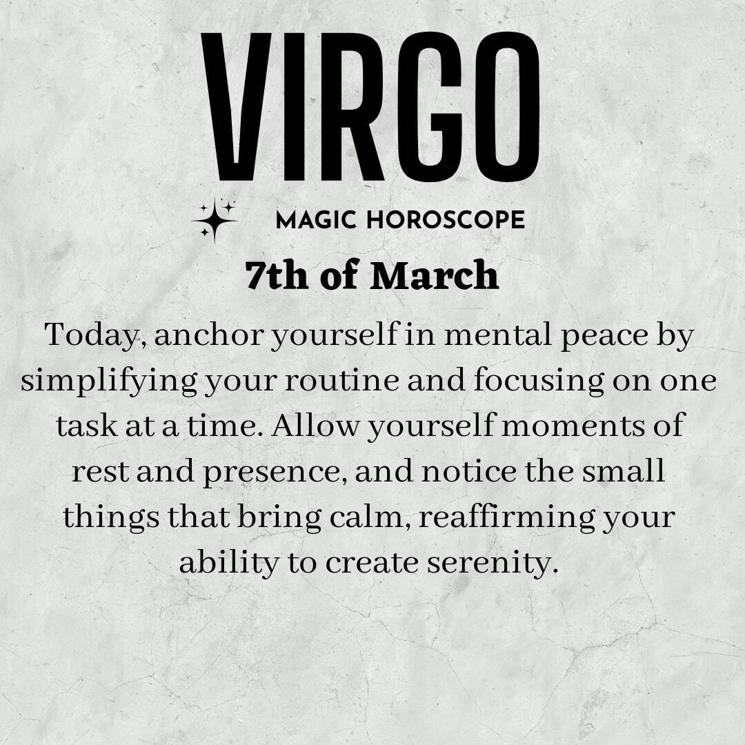 Mental peace is your anchor today, Virgo. The world can feel noisy, and your mind is quick to pick up every detail, every worry, every subtle shift in the atmosphere around you. Sometimes it seems as if you are absorbing the chaos of others, carrying it within you even when it isn’t yours to hold. Yet, even in the midst of this swirling energy, you have the quiet strength to create calm, to carve out a sanctuary within yourself. Remember, you have the power to choose what you allow into your inner world, and today, that choice is more important than ever.