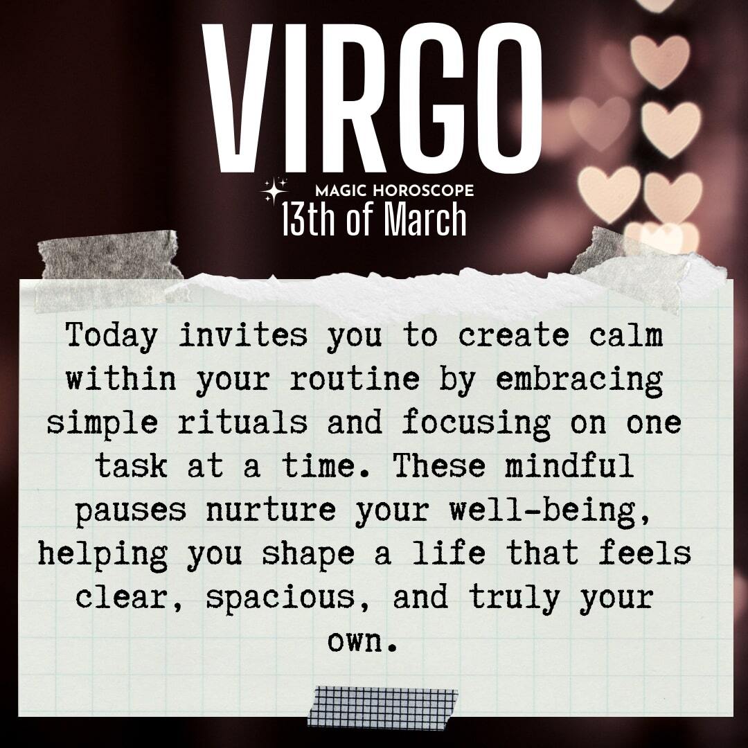 Your mind craves stillness, Virgo, and today is an invitation to cultivate peace within your daily routine. The world can feel noisy and demanding, pulling your attention in a dozen directions at once. Sometimes, it seems as if every moment is filled with expectations and responsibilities, each one clamoring for your immediate response. In the midst of this relentless pace, it’s easy to lose yourself in the swirl of tasks and worries, to feel as though you are being swept along by a current you cannot control. Yet, even when the outside world feels overwhelming, you have the power to create calm, even in the midst of chaos.