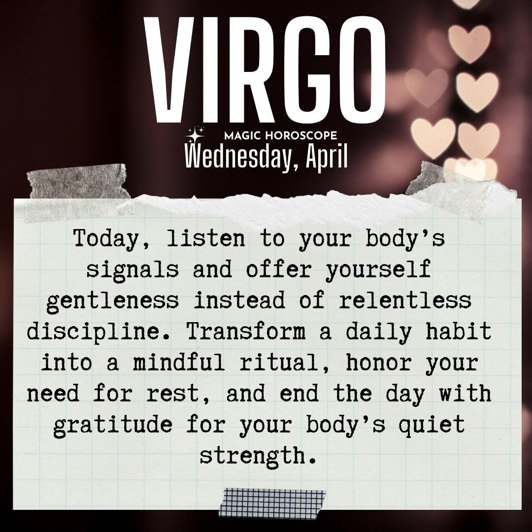 You’re being called to listen to your body today, Virgo. The subtle signals you’ve been ignoring—tension in your shoulders, that tired ache behind your eyes—are asking for your attention. Perhaps you’ve noticed a heaviness in your limbs or a restlessness that lingers even after a full night’s sleep. These are gentle reminders from within, urging you to pause and check in with yourself. You often pride yourself on your discipline, but sometimes self-care means softening, not pushing harder. It’s easy to believe that perseverance is always the answer, but there is wisdom in knowing when to release your grip. Notice where you’re holding on too tightly, and let yourself exhale. Your body is not a machine; it’s your home, and it needs your kindness.